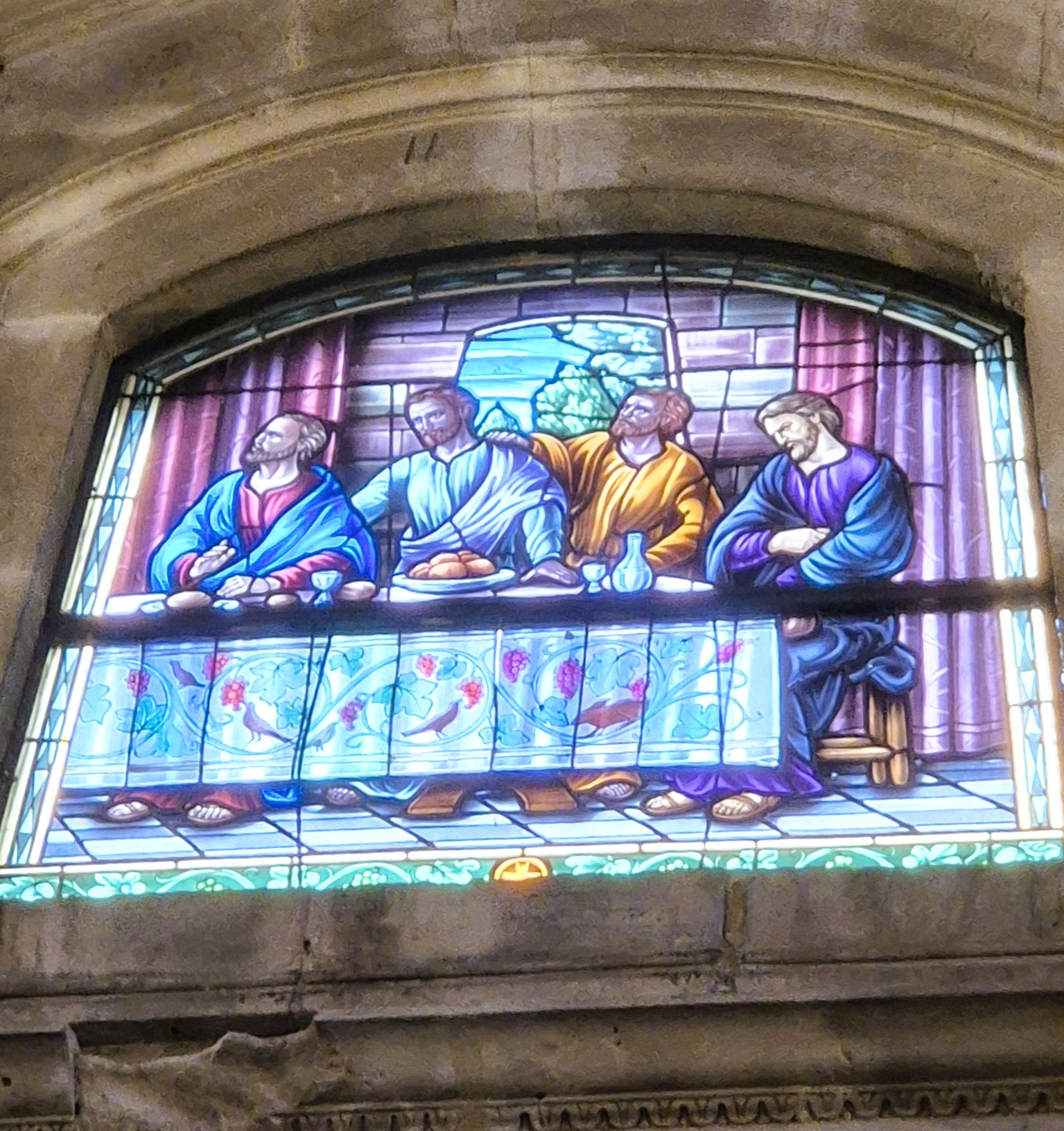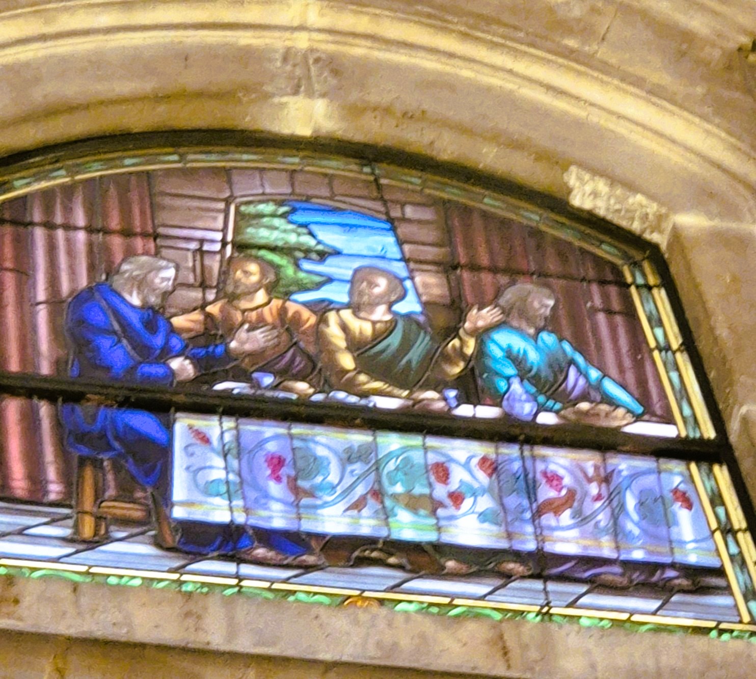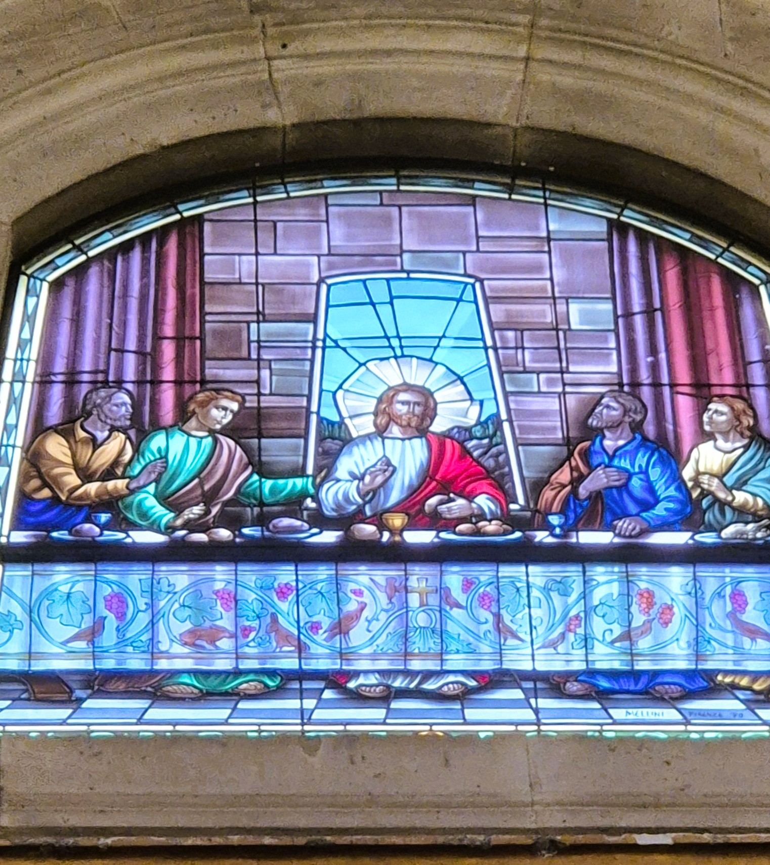 스테인드글라스는 최후의 만찬 장면을 세 부분으로 나누어 표현했으며,