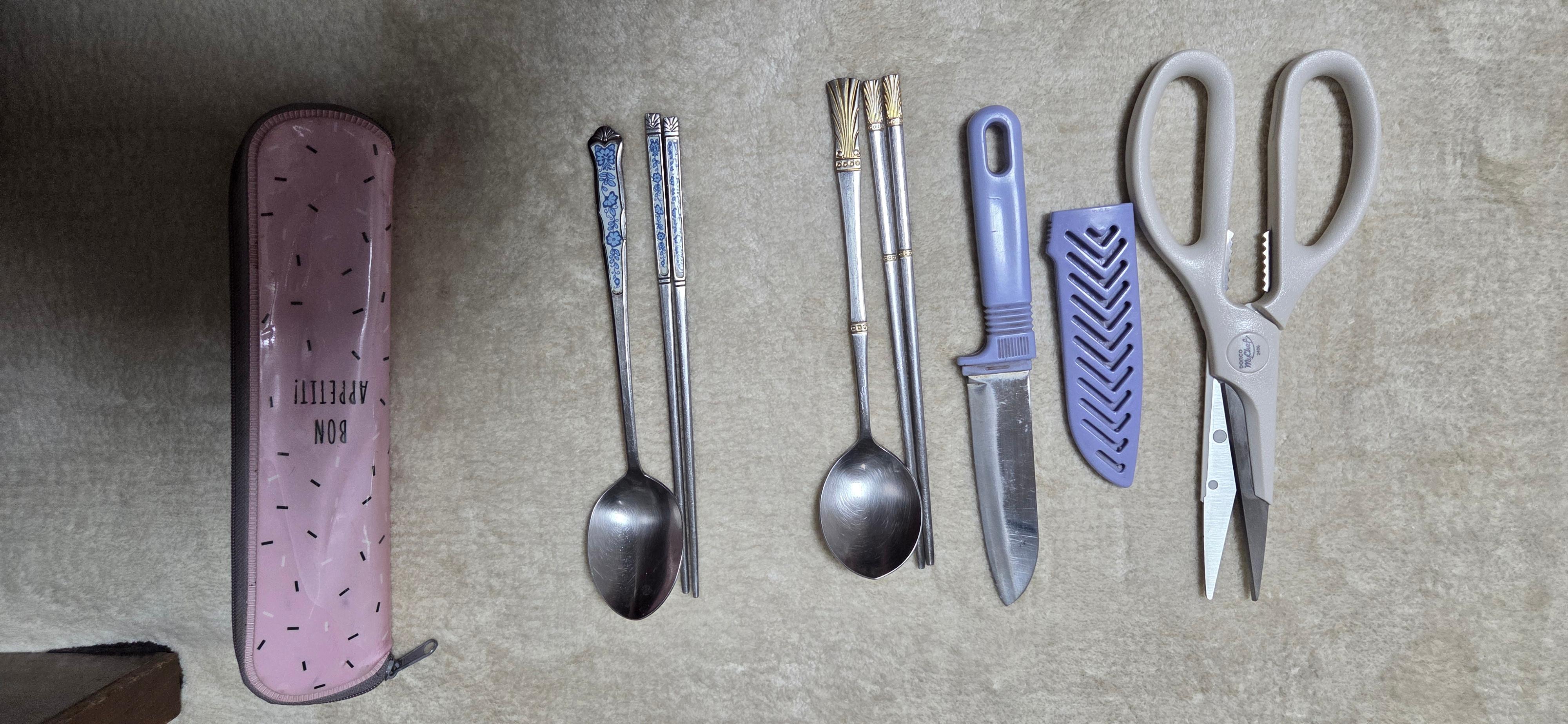 캠핑용 칼·가위.수저 세트: 가볍고 내구성이 뛰어남(보통은 다 있으나, 식칼은 무뎌 안드는 경우가 많고, 가위는 늘 있지 않다)