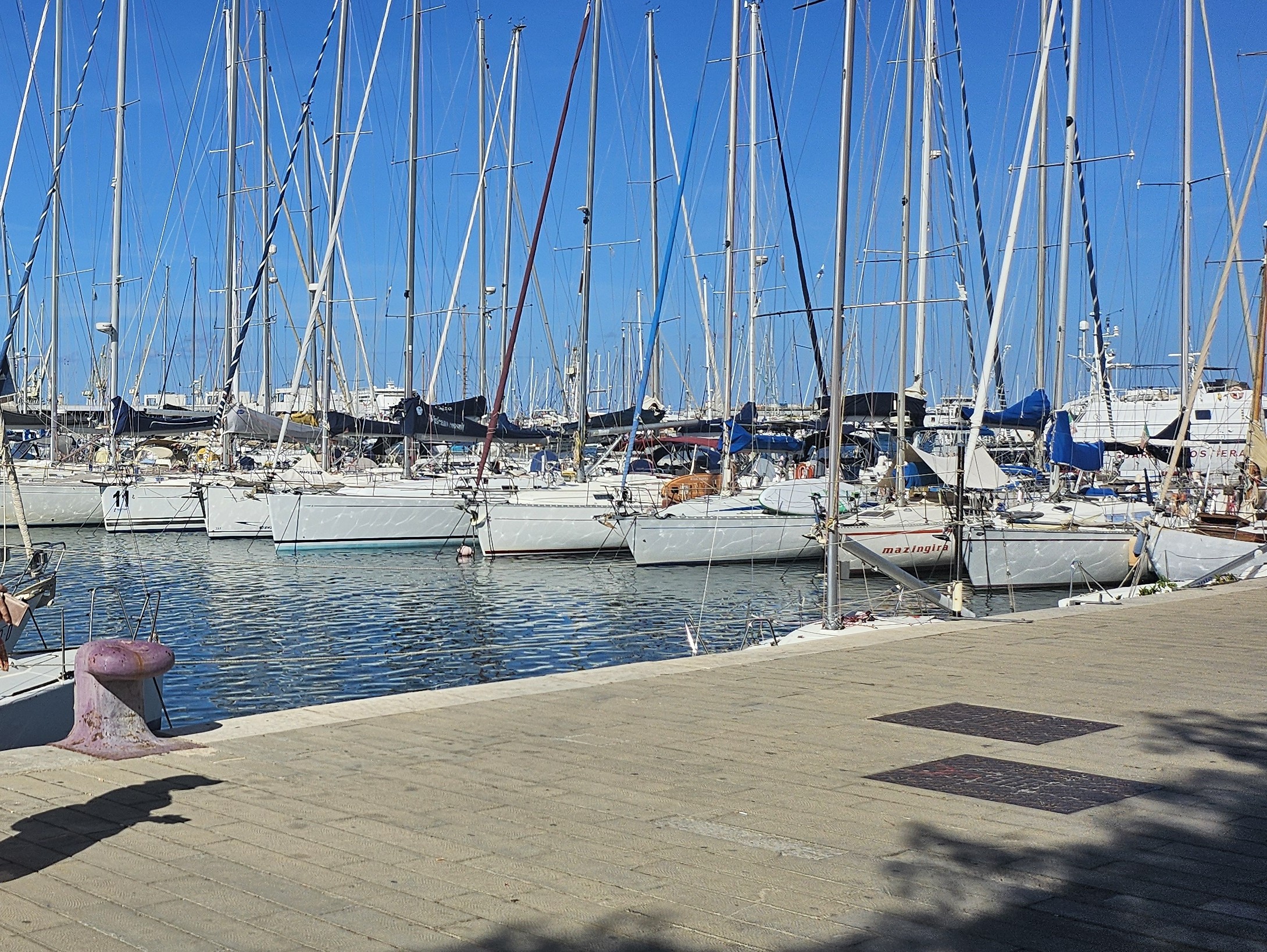 정박한 요트들은 물결 위에서 잔잔히 흔들리고 있었고, 하얀 선체가